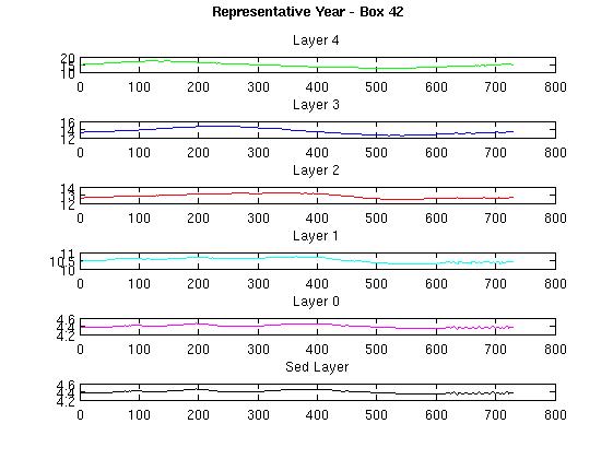 Each of the plots show the temperature data for each of the layers in the file with the top subplot the surface layer down to the bottom water column layer and the sediment layer (which has the same value as the bottom layer in the forcing files).