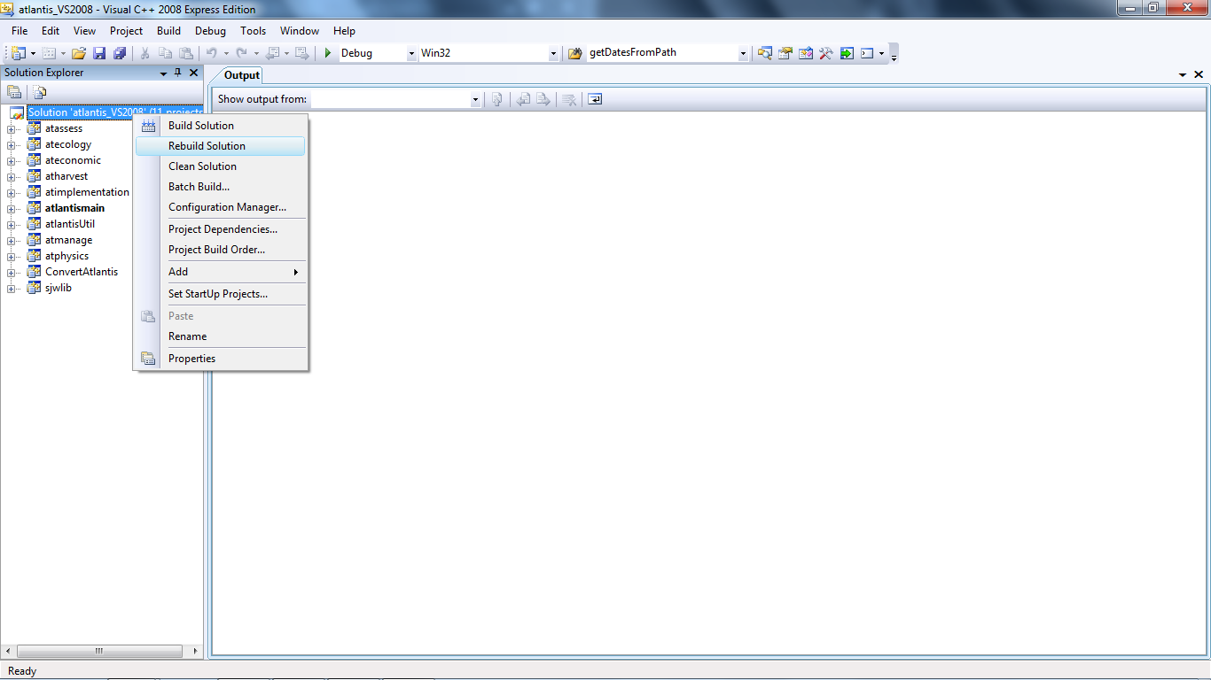 Once you have opened the project using visual studio you will be able to build it by right clicking on the atlantis solution and selecting Rebuild all.