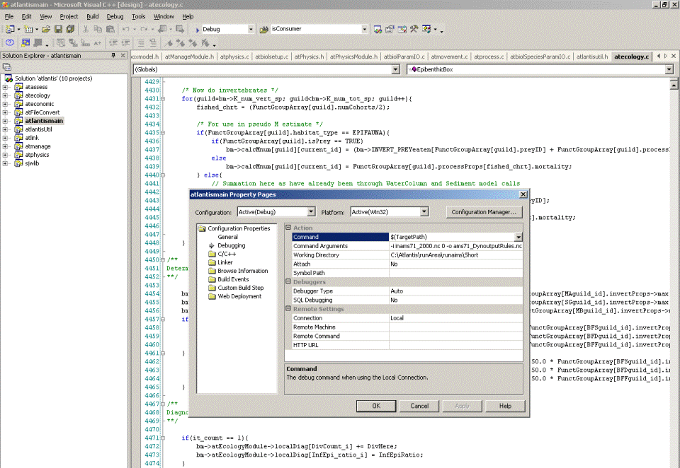 These instructions are provided for reference only. We do not recommend running Atlantis from within Visual Studio, it should be run via a windows command prompt. - Make sure that atlantismain is set as the startup project. - Right click on the atlantismain project and select the Properties option in the menu. - Select the Debugging option in the Configuration Properties menu. - Change the Command Arguments to the atlantis arguments that you normally use. - Change the Working Directory to the path to your input files.