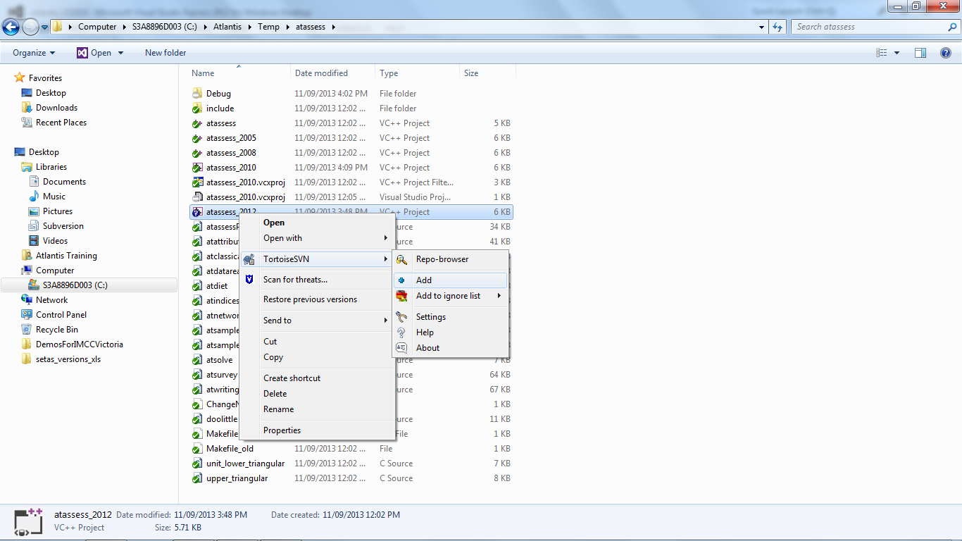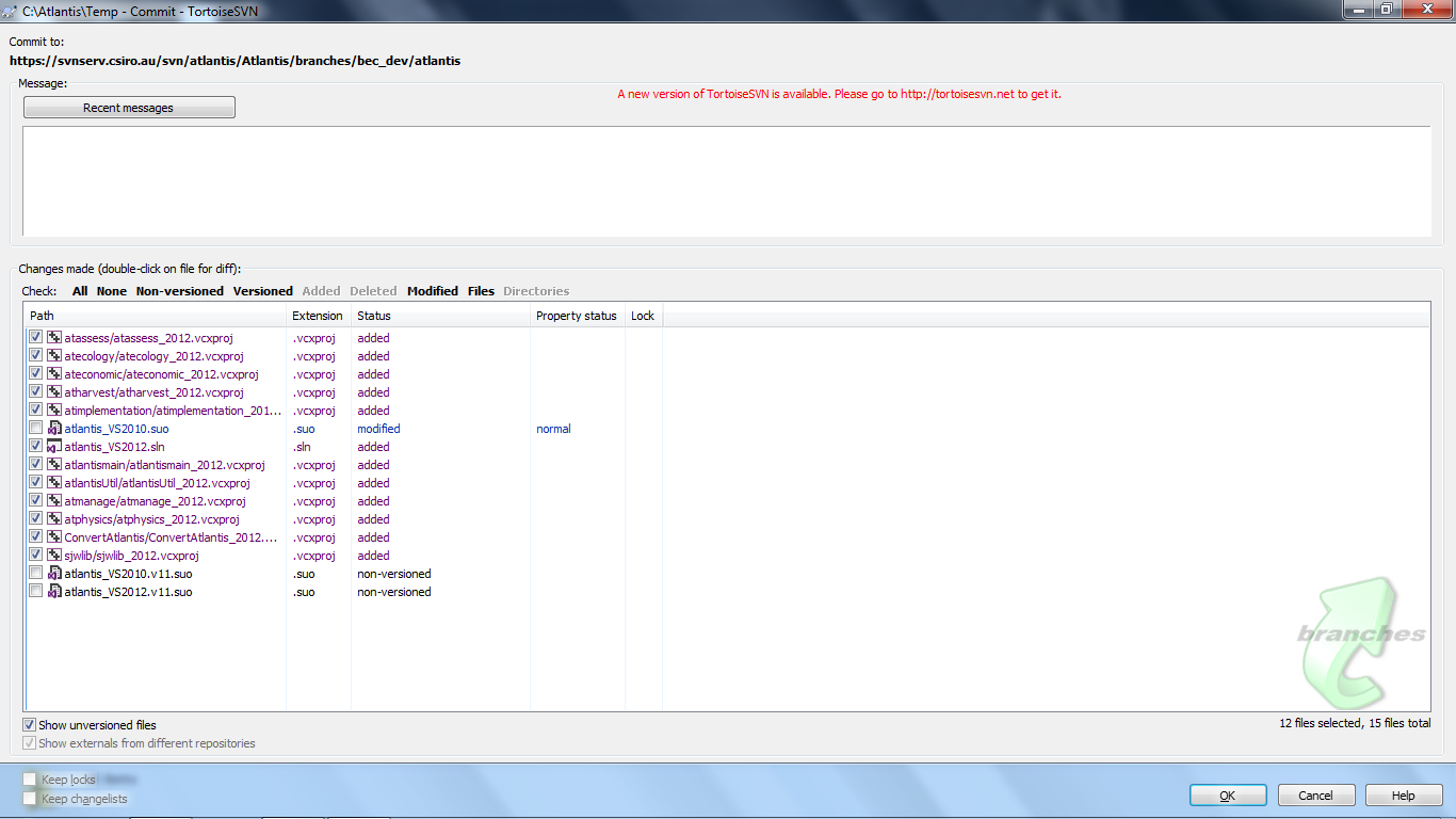 Before you check in the new files make sure you do a compare to make sure you are not changing any of the exiting files in the repository. Looking at the image below you can see that the atlantis_VS2010.suo file has changed. Don’t check this change in as it might stuff up people who are still using 2010.