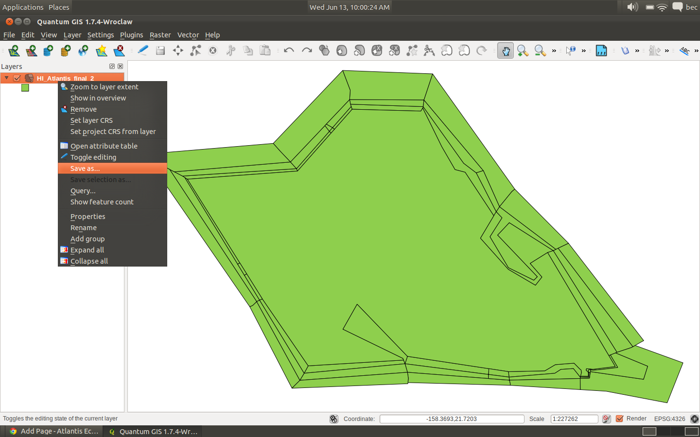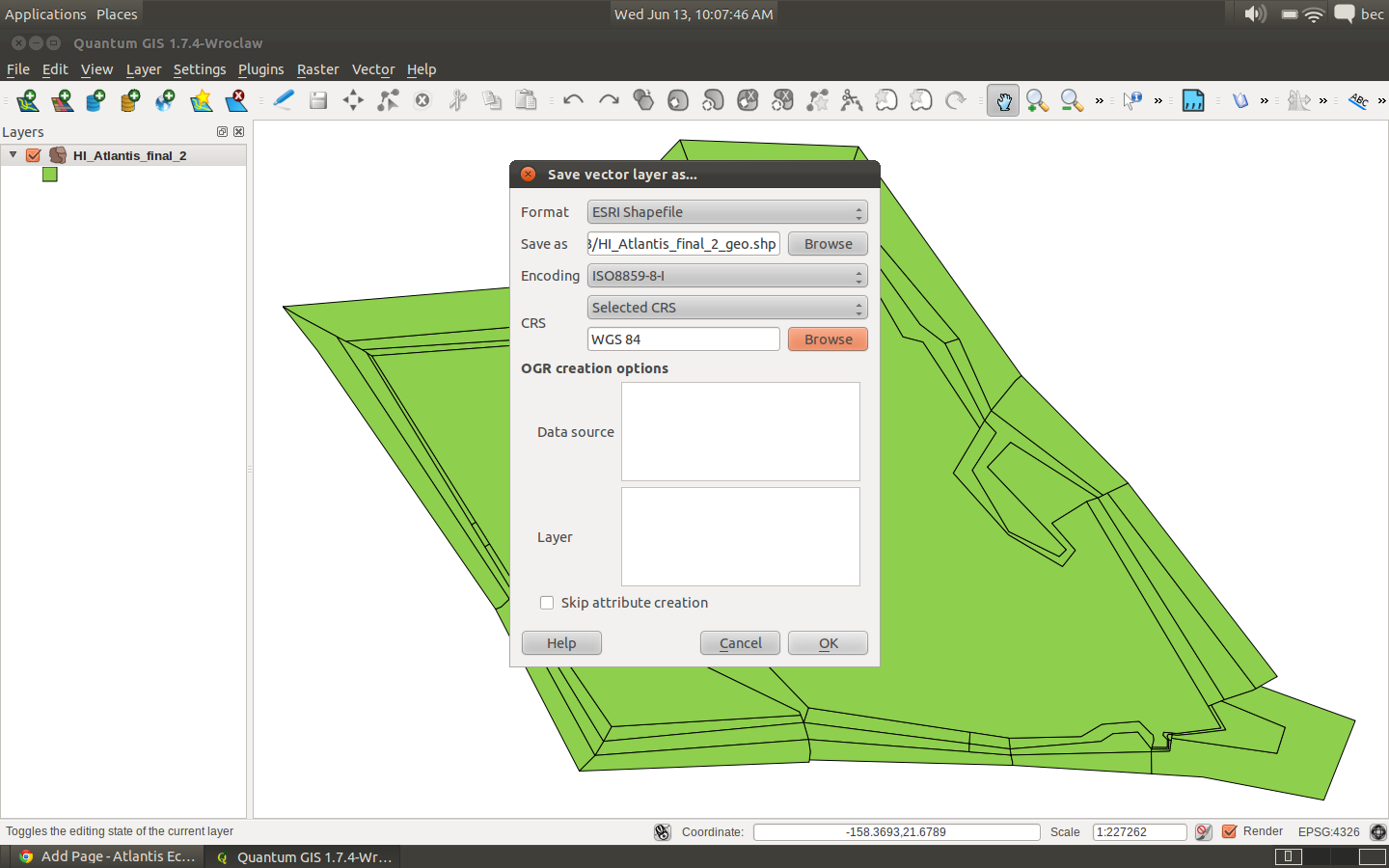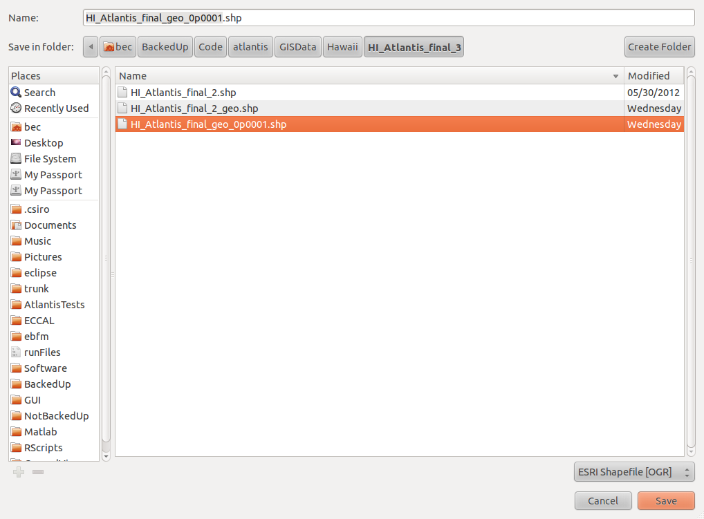 Remember to use a meaningful shapefile name - here we are calling the new shapefile HI_Atlantis_final_geo_0p0001.shp