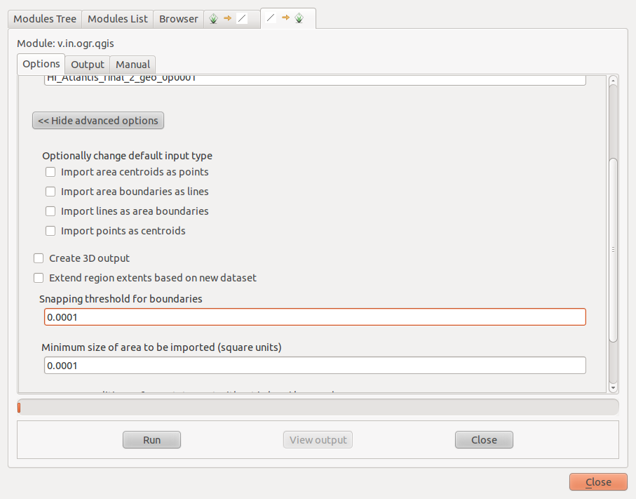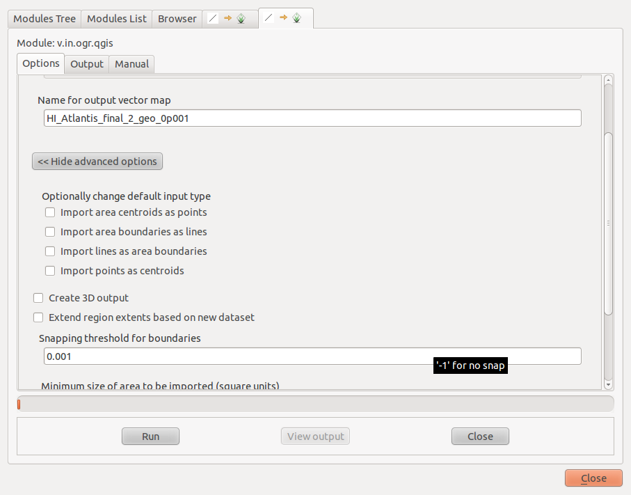 We are going to initially use a snapping value of ‘0.001’ so we will call the output file HI_Atlantis_final_2_geo_0p001 - see we are using the ‘p’ character to indicate where the decimal place is in the snapping value.