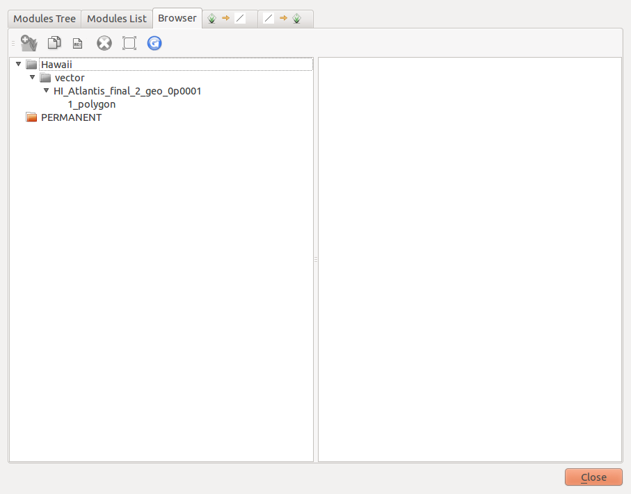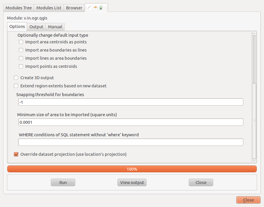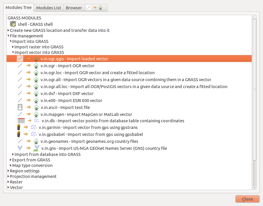 Under the ‘Modules Tree’ tab expand the ‘File management’ tree item, the expand ‘Import vector into GRASS’ and select the ‘Import loaded vector’