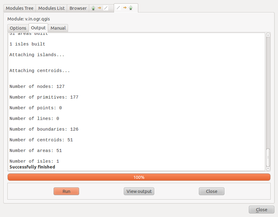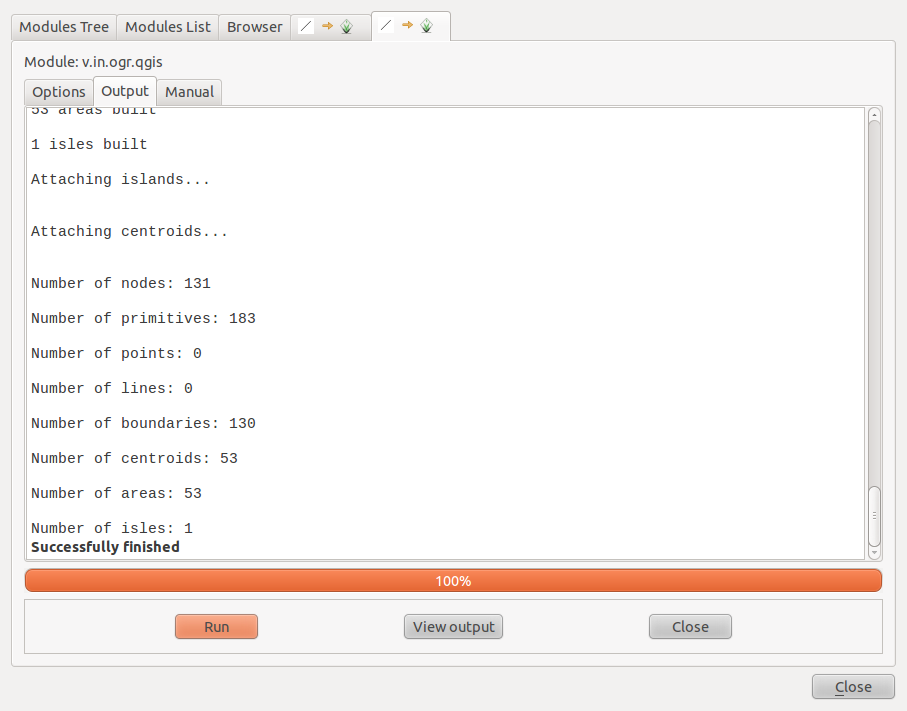 You can have a look at the output using the ‘Browser’ tab. You might have to click the refresh button. You can see in this example the importing process has resulting in three layers: