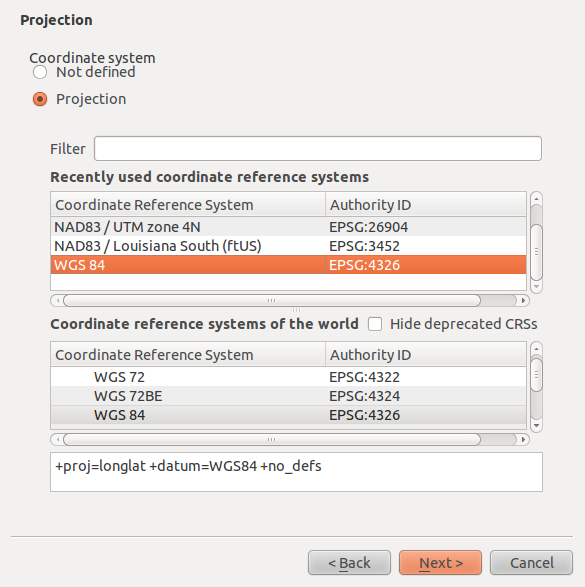 Click the Browse button next to the ‘CRS’ heading. At the top of the Coordinate System Reference table the is a Geographic Coordinate Systems tree. Expand this and scroll down to ‘WGS 84’. If you have done this before this CRS will be in the recently used table.
